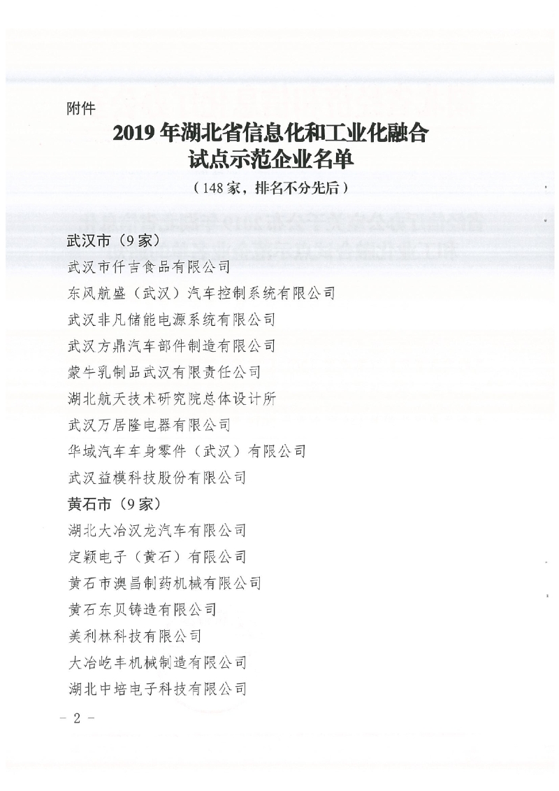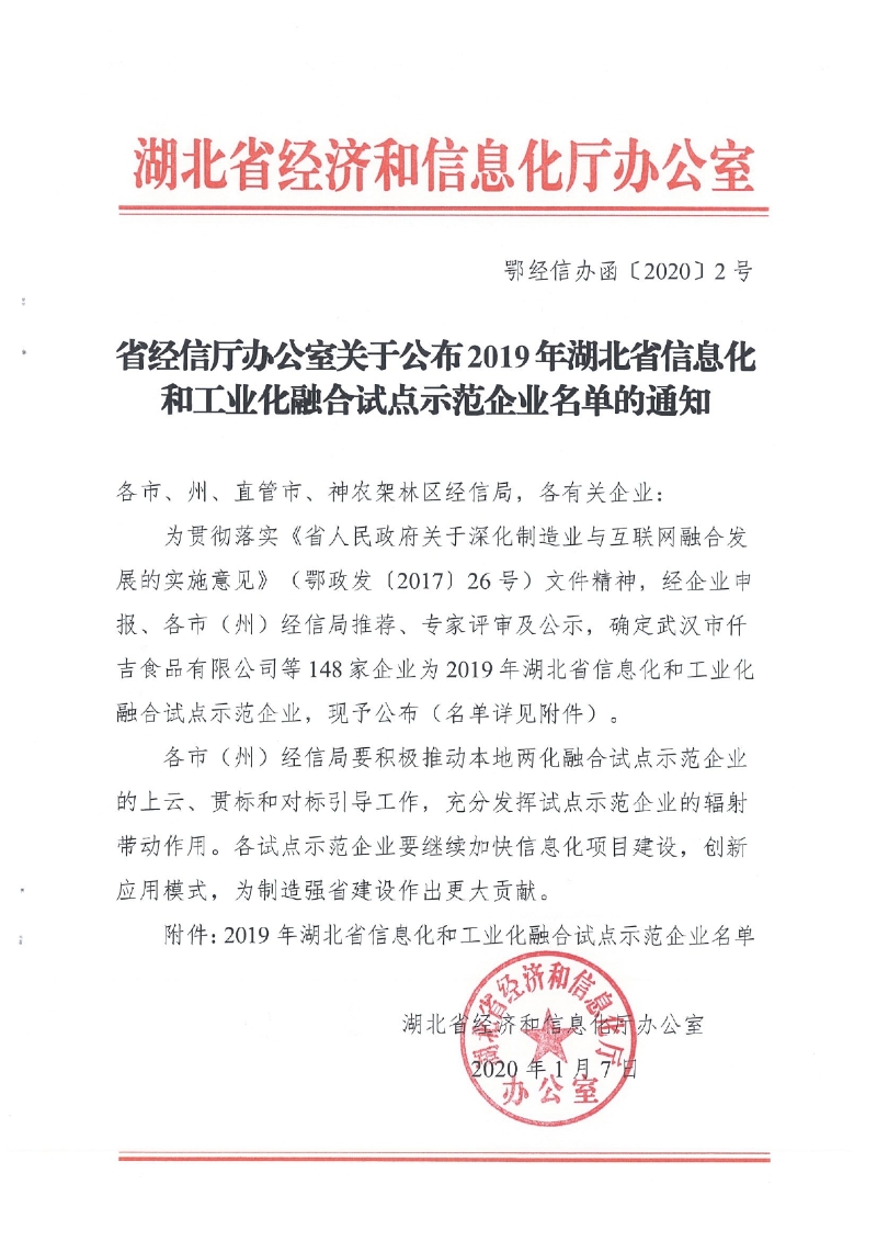 省經信廳辦公室關于公布2019年湖北省信息化和工業(yè)化融合試點示范企業(yè)名單的通知